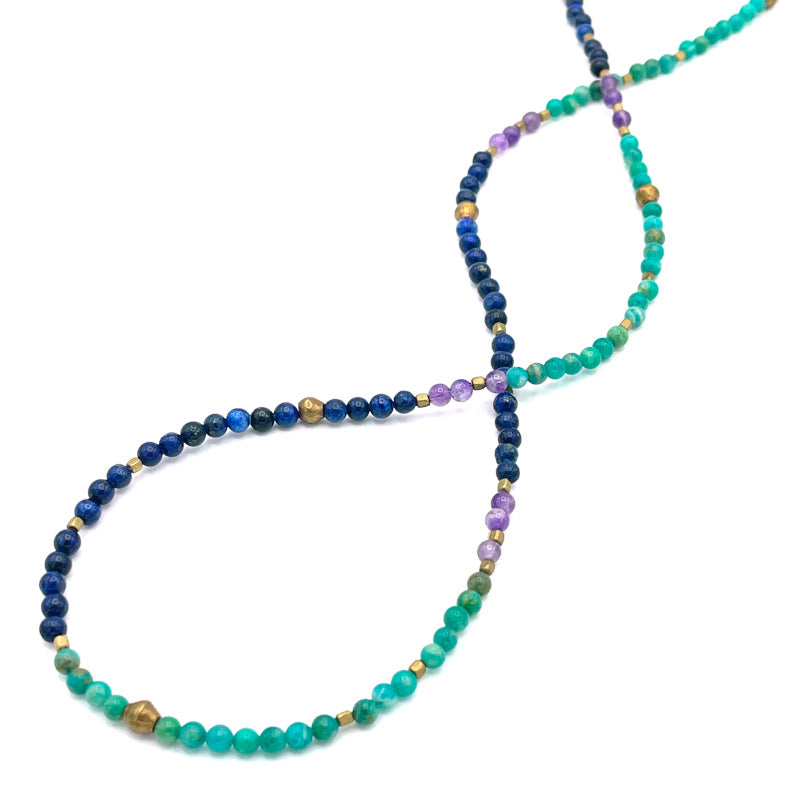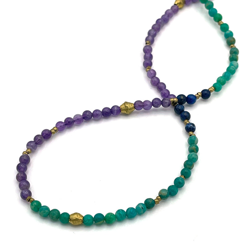 - Delicate and dainty long 3 gemstone necklace composed of 4mm genuine Amazonite, Amethyst and Lapis Lazuli stones and handmade tribal brass metal beads.